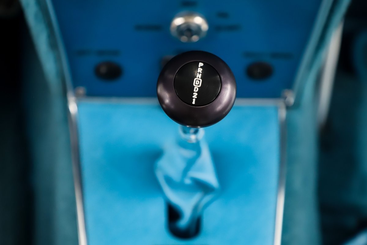 INTERIOR: The white interior is really refreshing against the beautiful blue paint. It has an American Auto Wire wiring system and fuse block. There are 12 volt receptacles, Specialty power windows and LED light indicators. A matched set of white face gauges are set in a nice billet bezel. The controls are clearly marked for the heat, air and lights. The Locar shifter is in the mini console along with a CD stereo, speakers are in the kick panels and behind the seats. The seats, door panels and inside of the cab are upholstered to match: white with blue trim. You do have some room behind the seats for extra storage. I like the white cushion grip wheel mounted on the tilt column. I'm 6 ft and fit in the car comfortably.