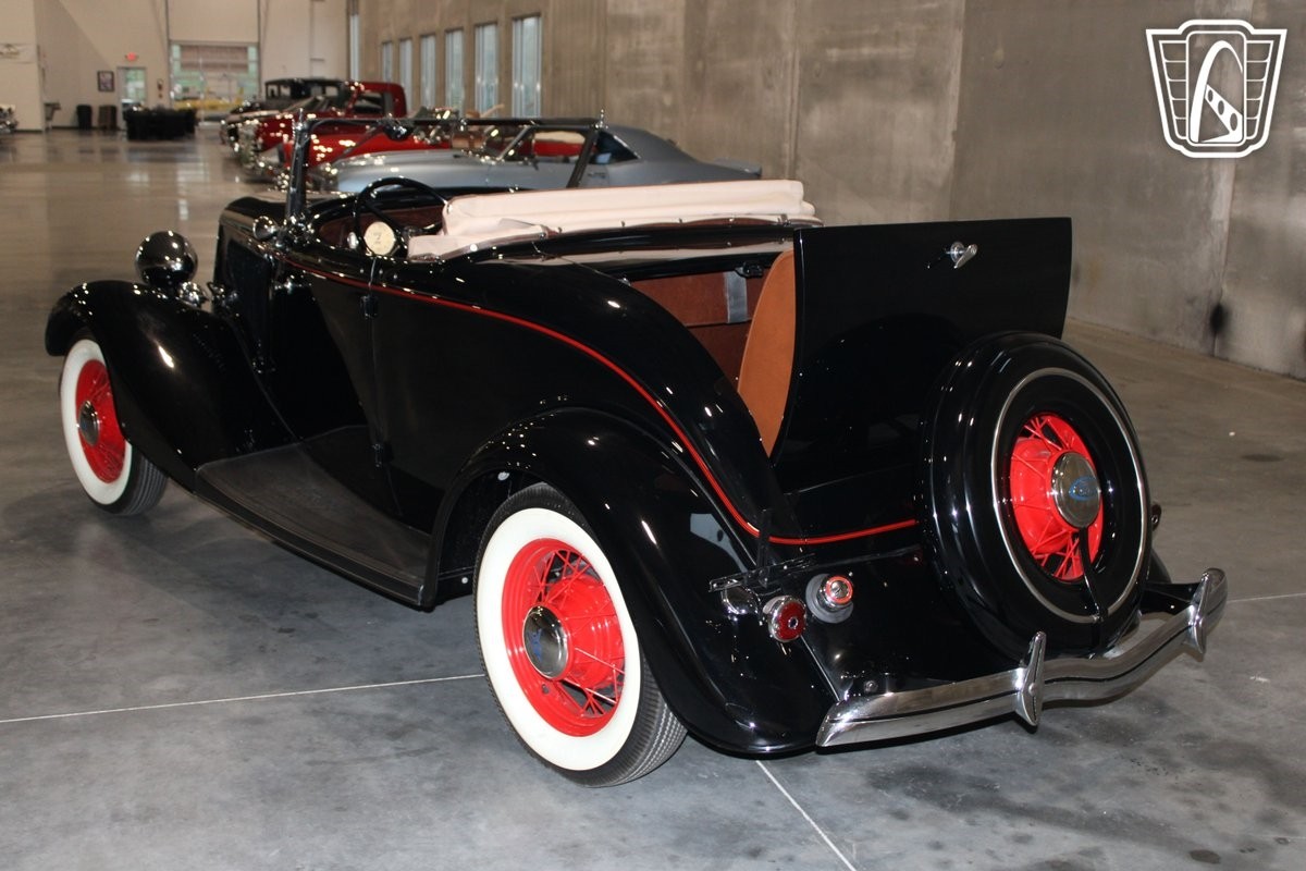 In summary, the 1934 Ford Roadster Model 40 Deluxe is a stunning representation of classic automotive design and engineering. With its black exterior, brown vinyl interior, and iconic Flathead V8 engine, this roadster offers a driving experience that is both nostalgic and exhilarating. Whether displayed at a car show or enjoyed on a leisurely drive, this vehicle is sure to be cherished by enthusiasts and collectors alike.
