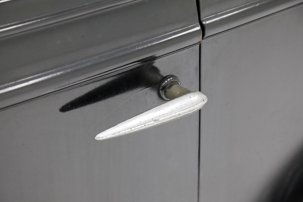 Coming to you in barn find condition, this exterior, while presenting with some chipping, staining, dulling, and surface rust showing through, there is no visible invasive rust to note. The running boards are losing their rubber covering and the fenders both front and rear are intact and retain their wonderful French curve design. 2 doors are seen on this sedan and display with simplistic door handles in pitted chrome on the exterior. Up front, the once chromed grille is now presenting in need of restoration with the chrome dulling, rusted and pitted. Single headlights flank the grille and are attached with a post that mounts to the front fenders and grille surround. Also, simple bumpers are seen on the front and rear of this car, both needing rechroming. The long cowled hood sports a trio of vent louvers on either side covering the unrestored engine bay, and butts up to the radiator cover up front. The roof is a canvas panel and is cracking from age but has not pulled away from the steel substructure. Black steel 17-inch wire wheels are all around and are wrapped in thin rubber tires which have good tread but are showing dry rot in the sidewalls.