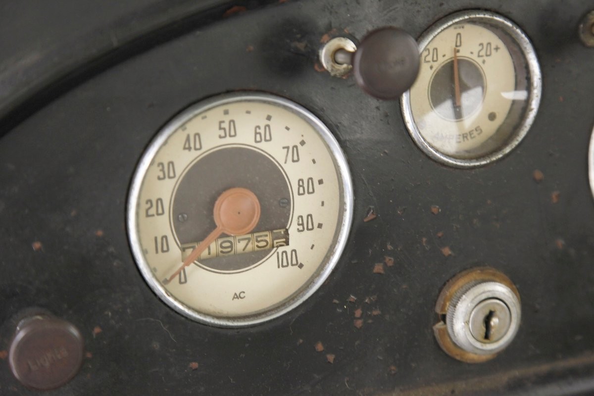 In need of restoration with soiled and stained pale green broadcloth coverings making up the door panels, sagging headliner, and wrap around rear panel. Buckets are noted for the front and a bench for the rear, with the buckets covered in off white decorative slipcovers and the bench wearing a Mexican blanket. We do not know the condition of the underlying material, but their original shape is still retained. Factory brown mohair is on for the rear side panels, and provides a contrast to the pale green. Up front is the original unrestored dash in black and a centrally located trio of gauges and various pull knobs. A black Bakelite steering wheel fronts the dash and for the floors the carpet is gone exposing the mixture of wood and steel supports that make up the flooring.