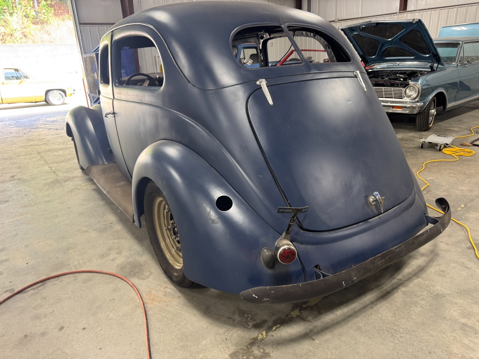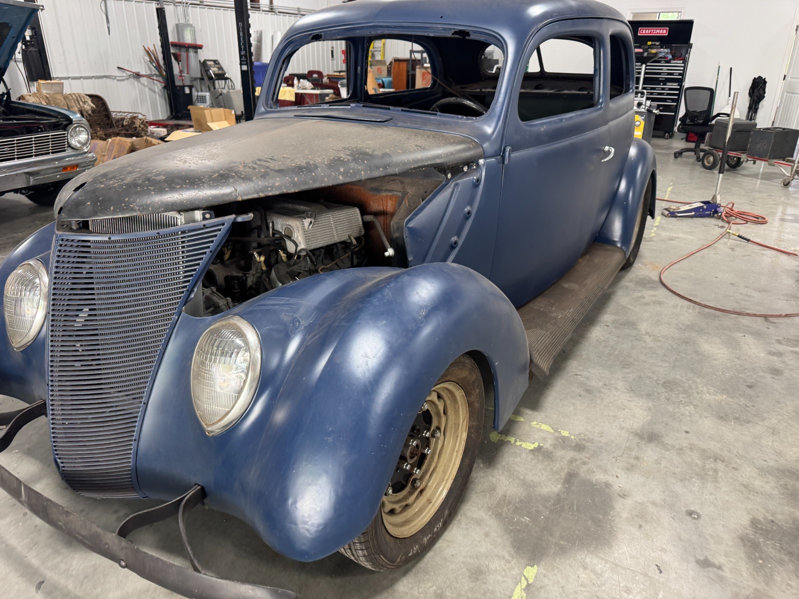 The 1937 Ford Slantback has a blue exterior color. This Ford model features a302 engine, two doors, ., The car has air ride . Engine is around a 95 efi non functional at this time. transmission included. I bought the car in 2018 but have never completed. the car has always been warehoused. You can see the parts included . Car comes with electric window kit and glass. Body in great shape with no rust. Body was done when i purchased it . Im sure im forgeting something but will add it when i come across it.