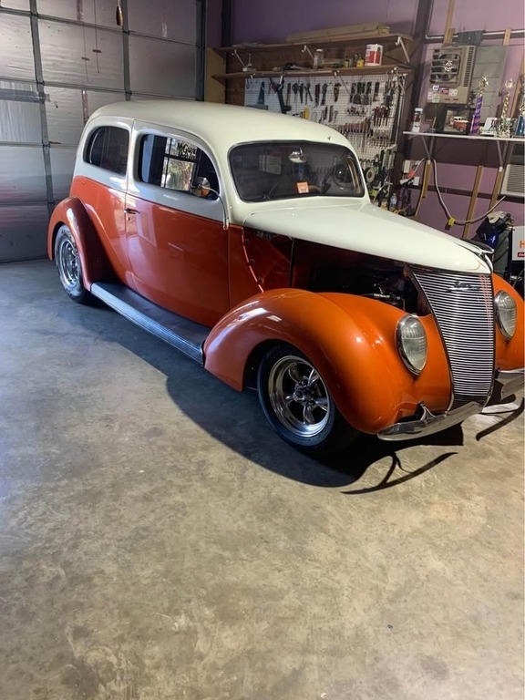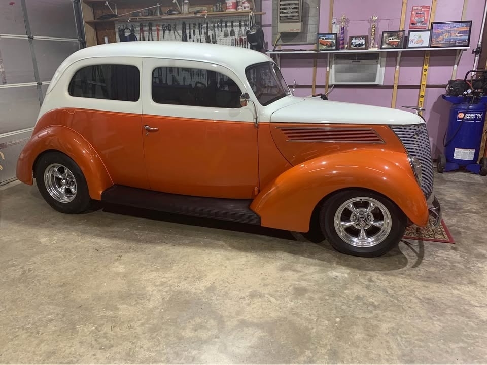 Classic pre-war styling meets modern performance in this beautifully built 1937 Ford Model 78 Slantback Sedan. Finished in a striking orange over cream white two-tone exterior with a complementary brown and white interior, this all-steel street rod delivers timeless looks with upgraded drivability.