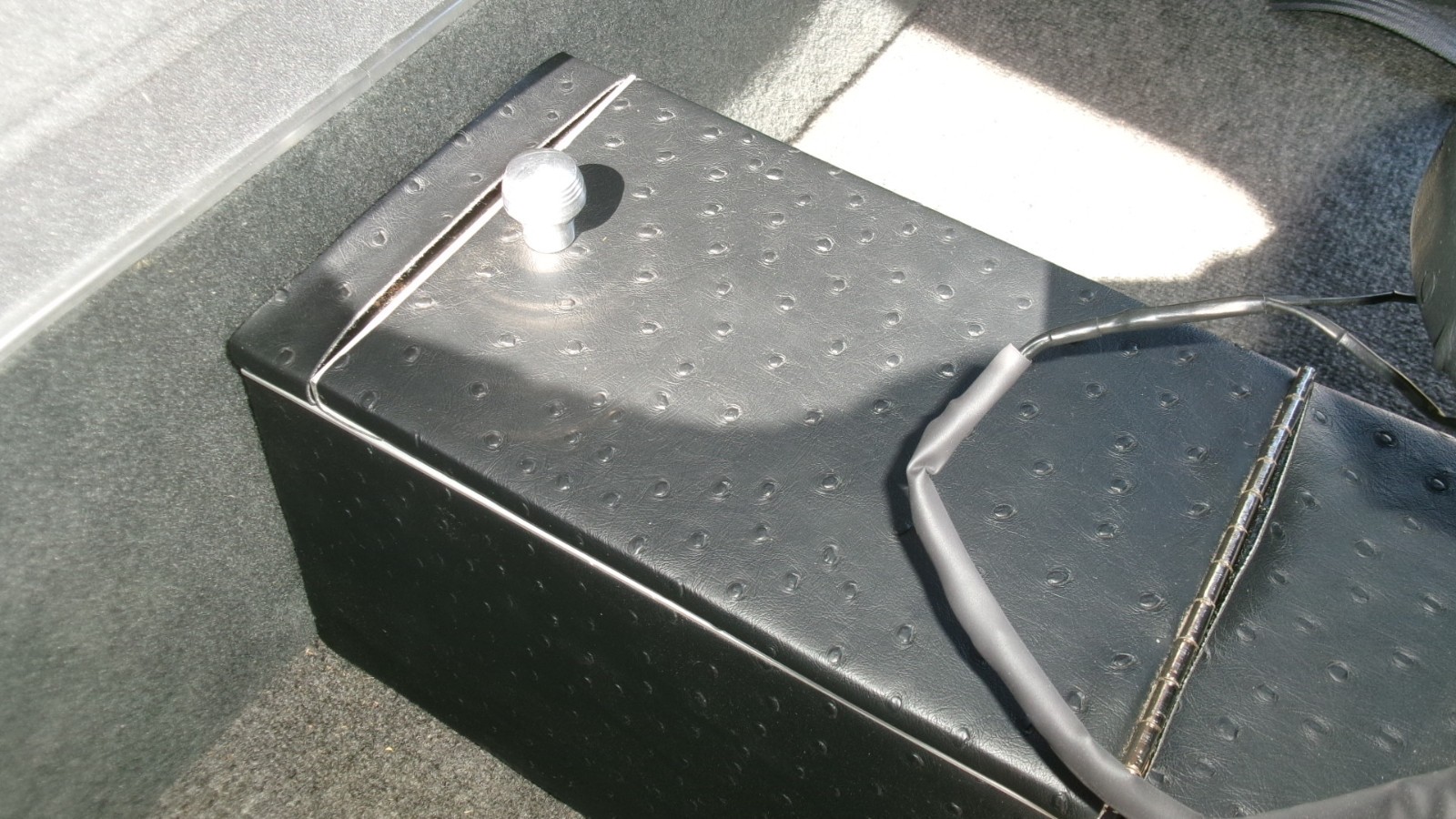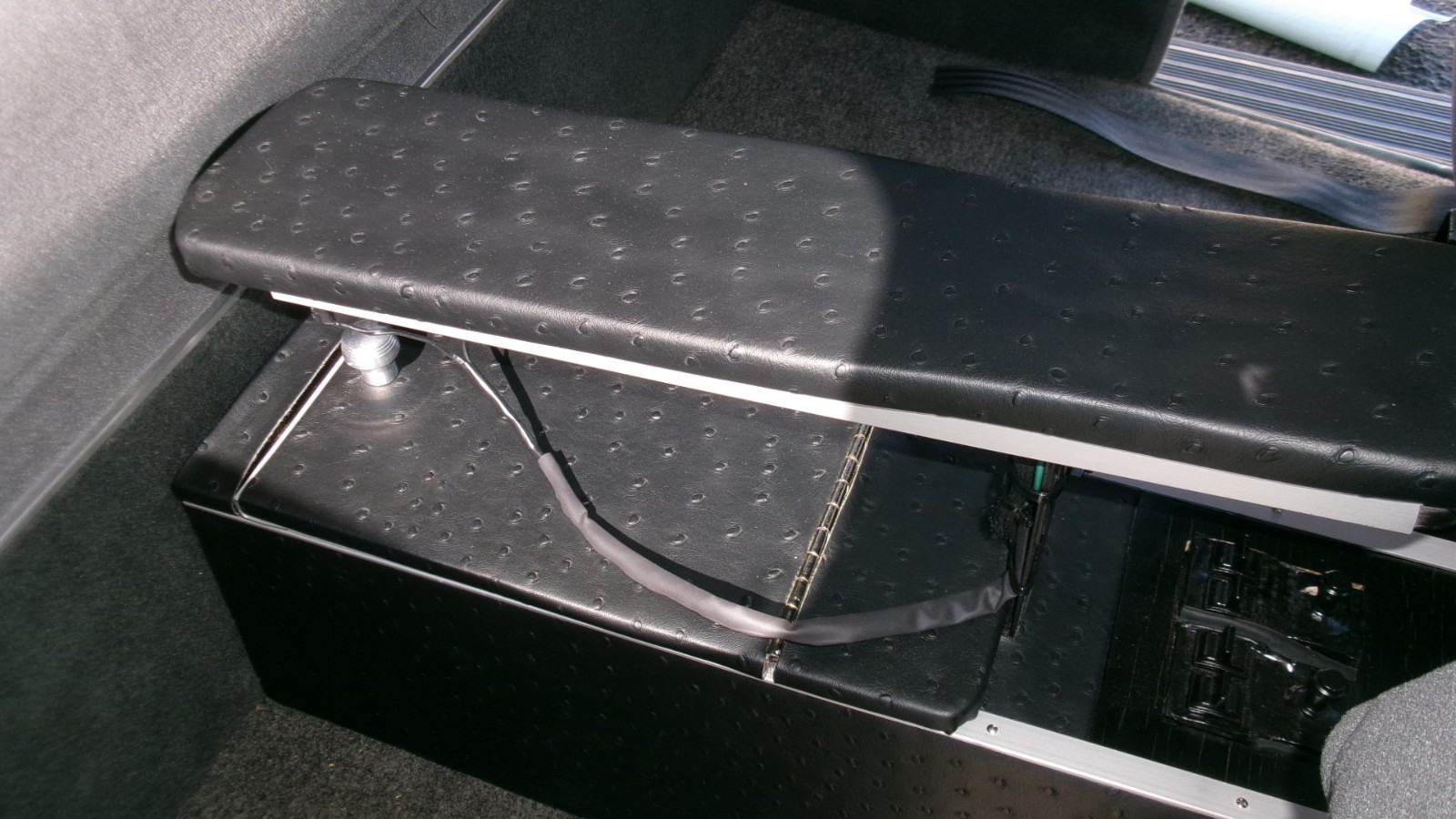 Custom center console featuring Faux Ostrich Vinyl Power seat controls, cup holder, Foot Well Lighting, Sliding arm rest, lidded storage,USB/Lighter Power outlet