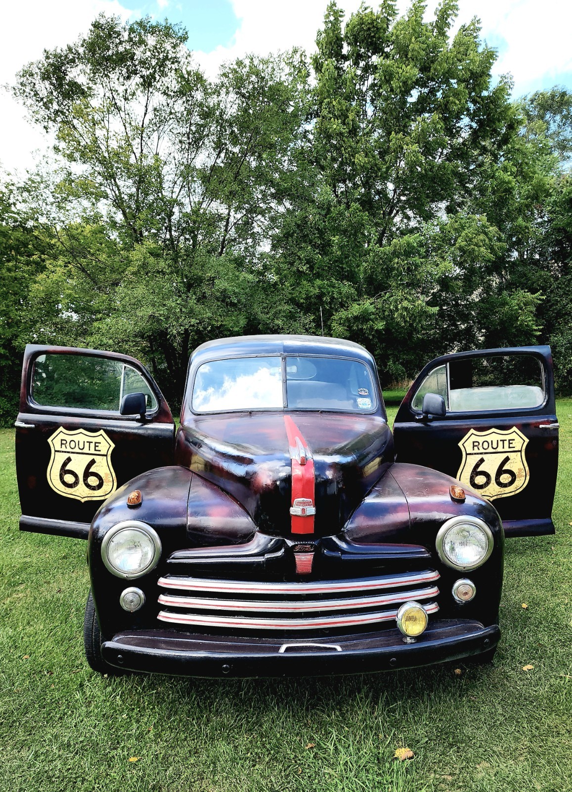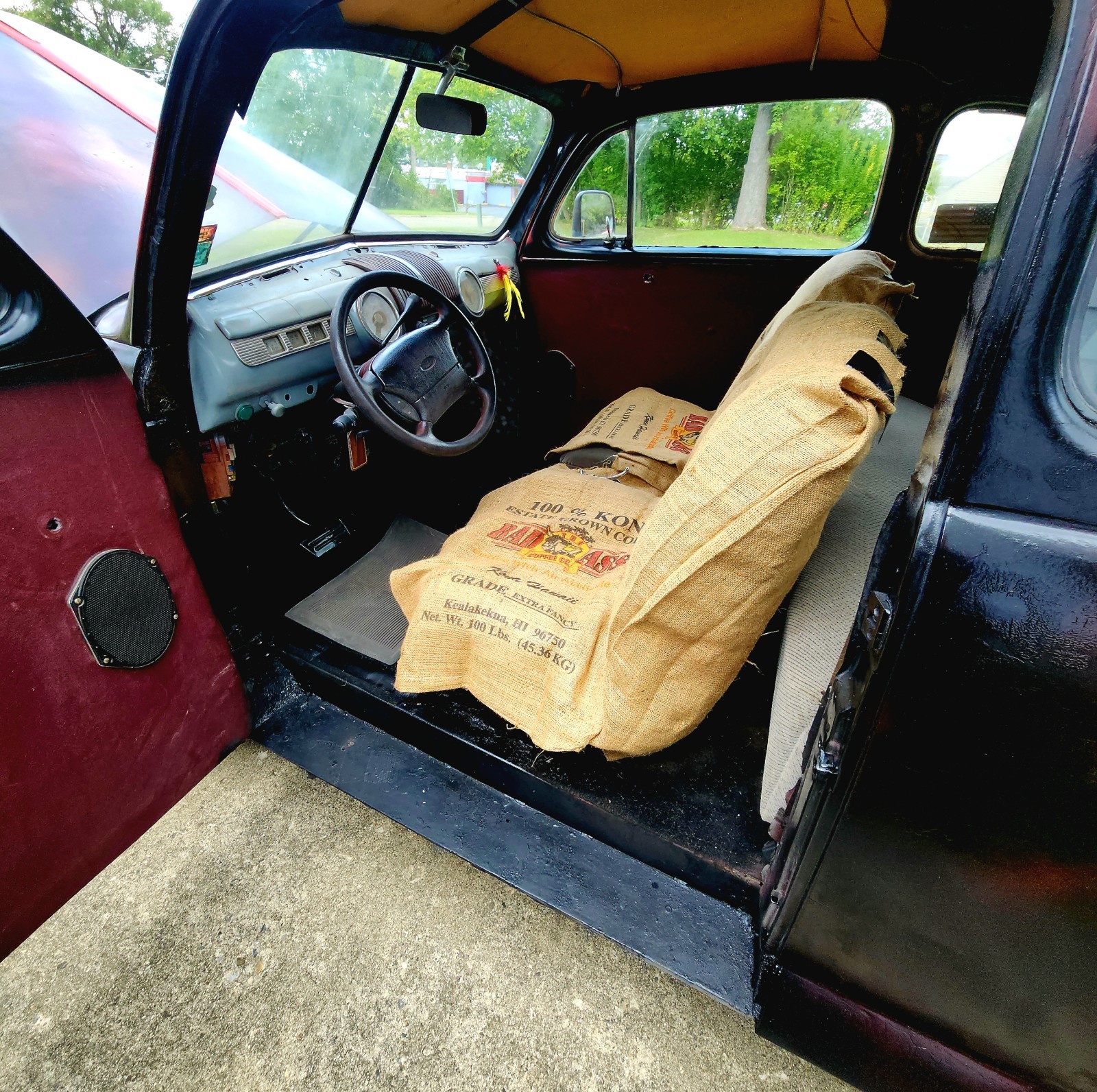 Bare bones adorn the interior in typical rat fashion. Bucket seats with removable coffee sack covers. The seats are supportive and comfortable. Carpet covers the floor.. The driver's window is foggy. The trunk is solid and huge, about the size of a New York City apartment. The original 1947 owner's manual goes with the car. There is also a title.