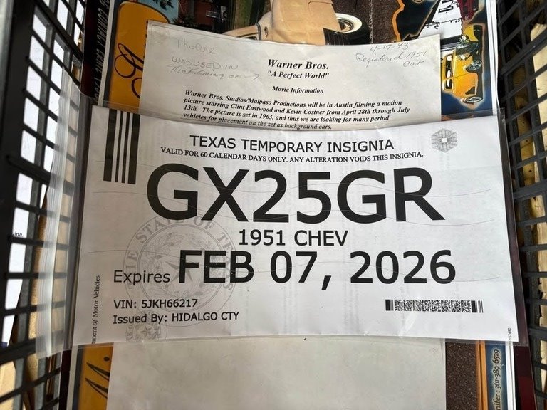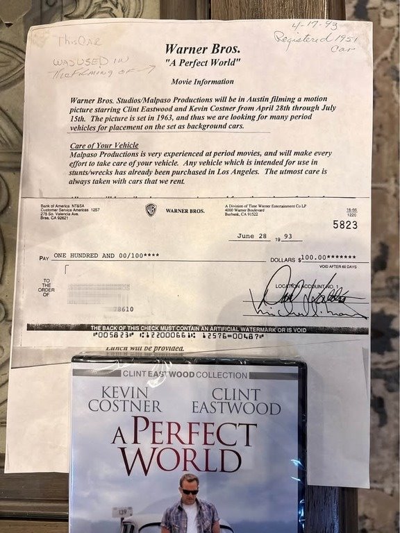 Adding to its uniqueness, this vehicle comes with documentation showing it was used in the 1993 Warner Bros. film “A Perfect World” starring Clint Eastwood and Kevin Costner, including a photo of the studio check—an incredible piece of provenance for any collector.