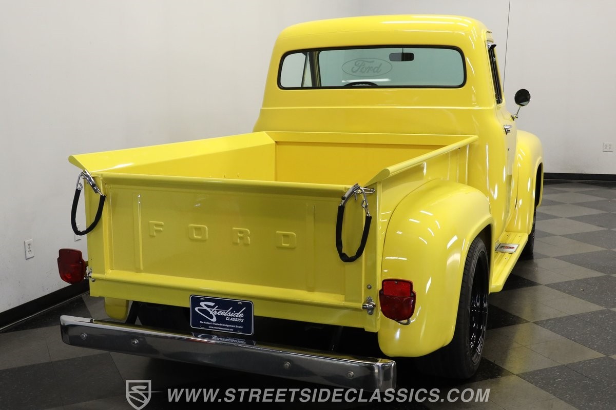 Under the hood, this F-100 is powered by a 239 Flathead V8, delivering smooth performance and a satisfying rumble. Paired with a 3-speed manual transmission, this truck offers an engaging driving experience that is both authentic and enjoyable. The engine bay is neatly presented, with the signature yellow paint carrying over onto the firewall and a Ford single-barrel carburetor feeding the V8. All belts, hoses, and soft parts appear in good condition, reflecting careful attention to detail throughout.