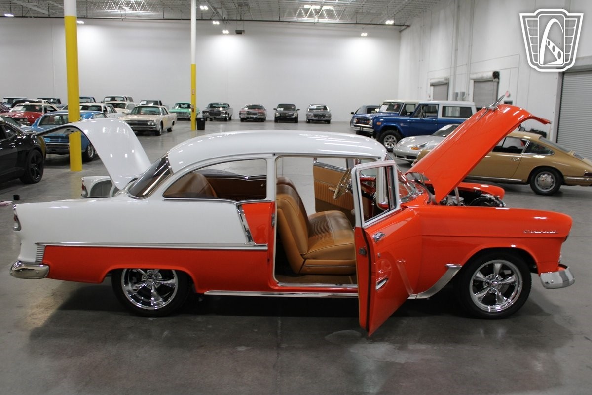 Gateway Classic Cars of Las Vegas is excited to digitally present this classic piece of American automotive history: the 1955 Chevrolet Bel Air. This iconic vehicle stands out with its striking orange and white exterior, a color that captures the spirit and vibrancy of the era. The bold hue is complemented by custom wheels that add a touch of modern flair while maintaining the car's vintage charm.