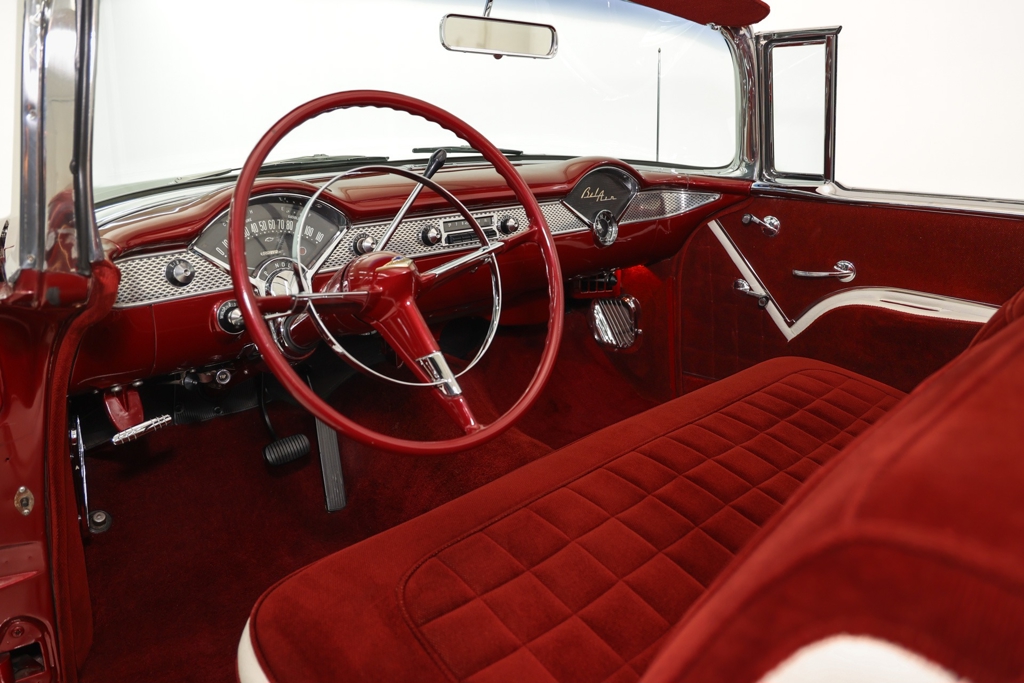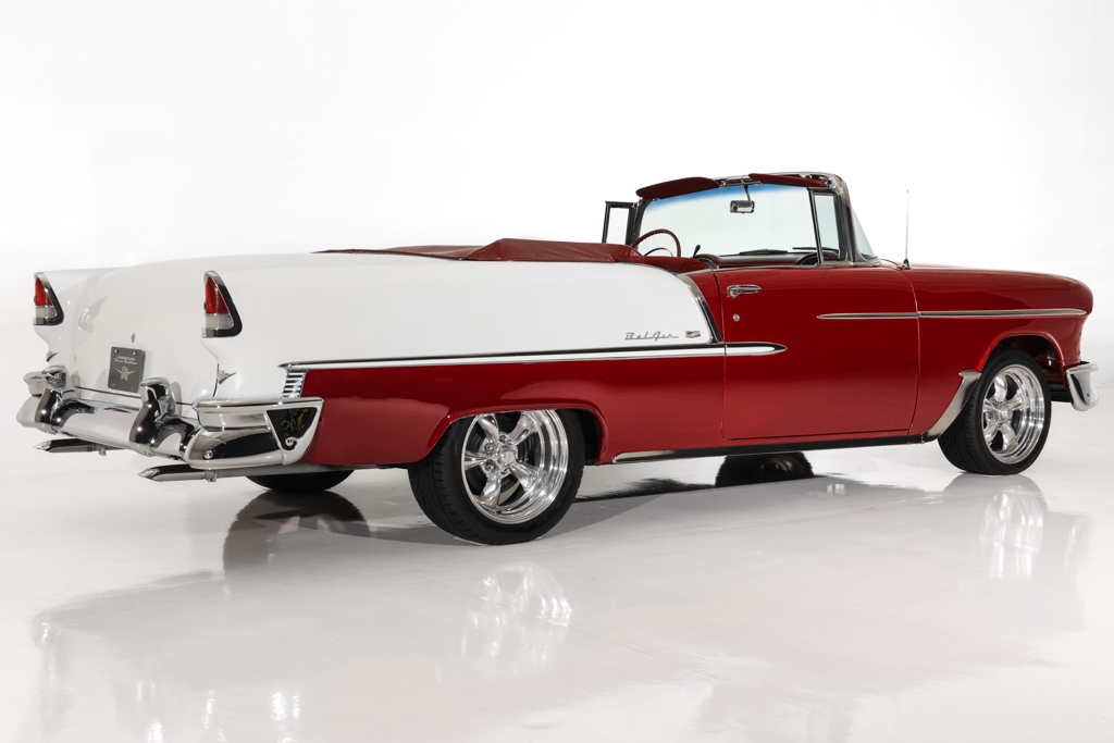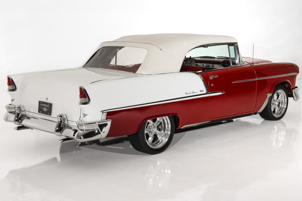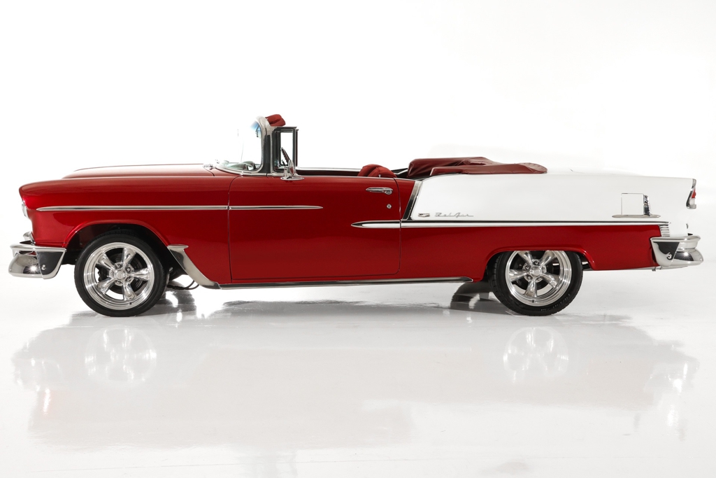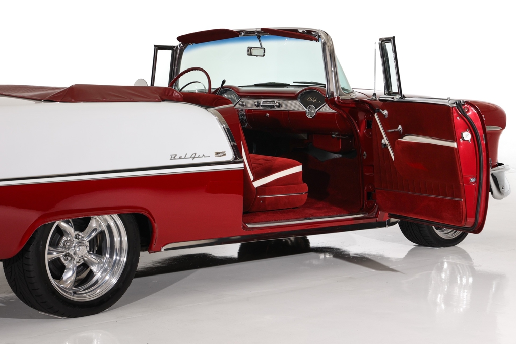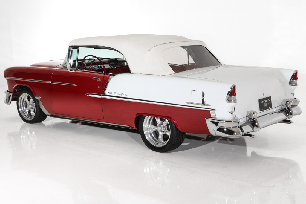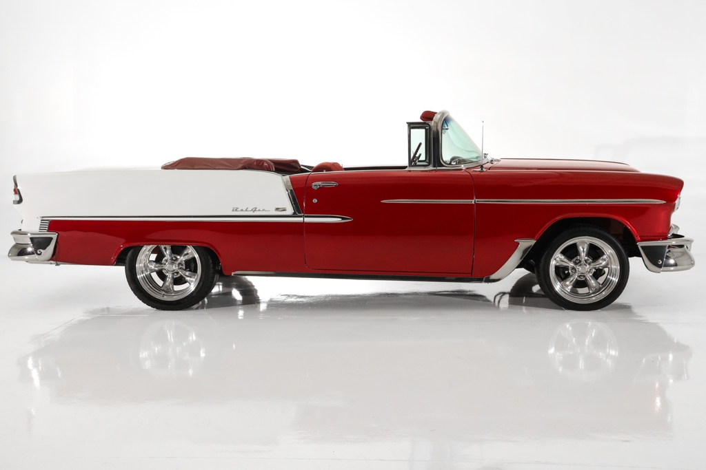 Iconic Ruby Red Metallic and Ivory 1955 Chevrolet Bel Air convertible with white top and matching dark red interior. Powered by a smooth running 327 c.i. V8 engine, automatic transmission and stock rear with a 3.55 gear. The engine compartment is highly detailed with beautiful paint and plenty of chrome. This Bel Air has great metal structure resulting in very good panel fit and lines. Beautiful chrome bumpers, grille and Bel Air stainless trim that makes the Ruby Red paint really pop, especially in the sun. The white power convertible top is in great condition and the rare chrome top frame sets this Bel Air apart from the rest, for that show car appearance. The very nice matching dark red custom interior is in excellent condition and sits very comfortable. The custom interior flows through to the trunk for that impressive finished look. The dash has been painted ruby red to match the exterior and the chrome gauges and stainless trim all look fantastic. The undercarriage is rock solid with excellent frame, floors and trunk. This American Dream Machine is rolling on polished 17 inch American Racing wheels and performance tires for drop dead good looks.