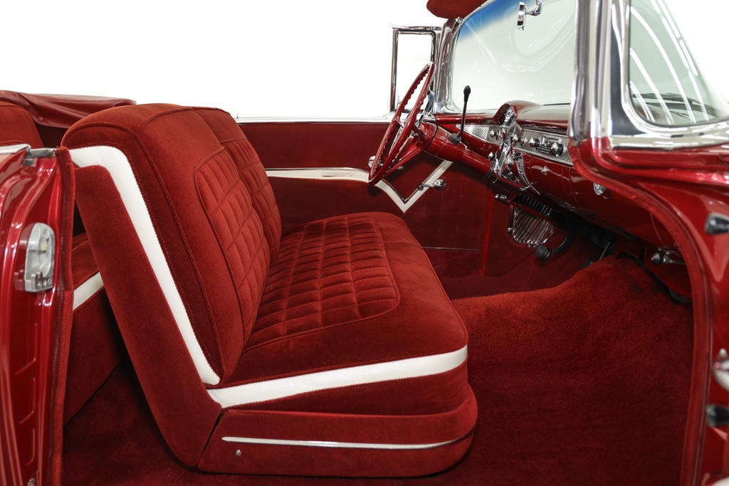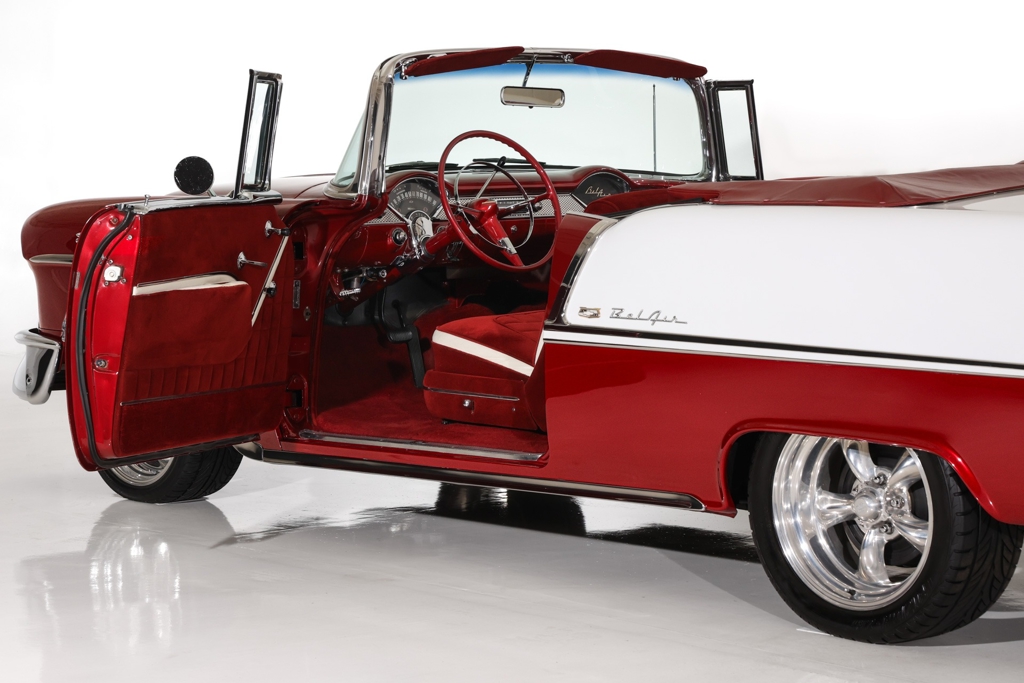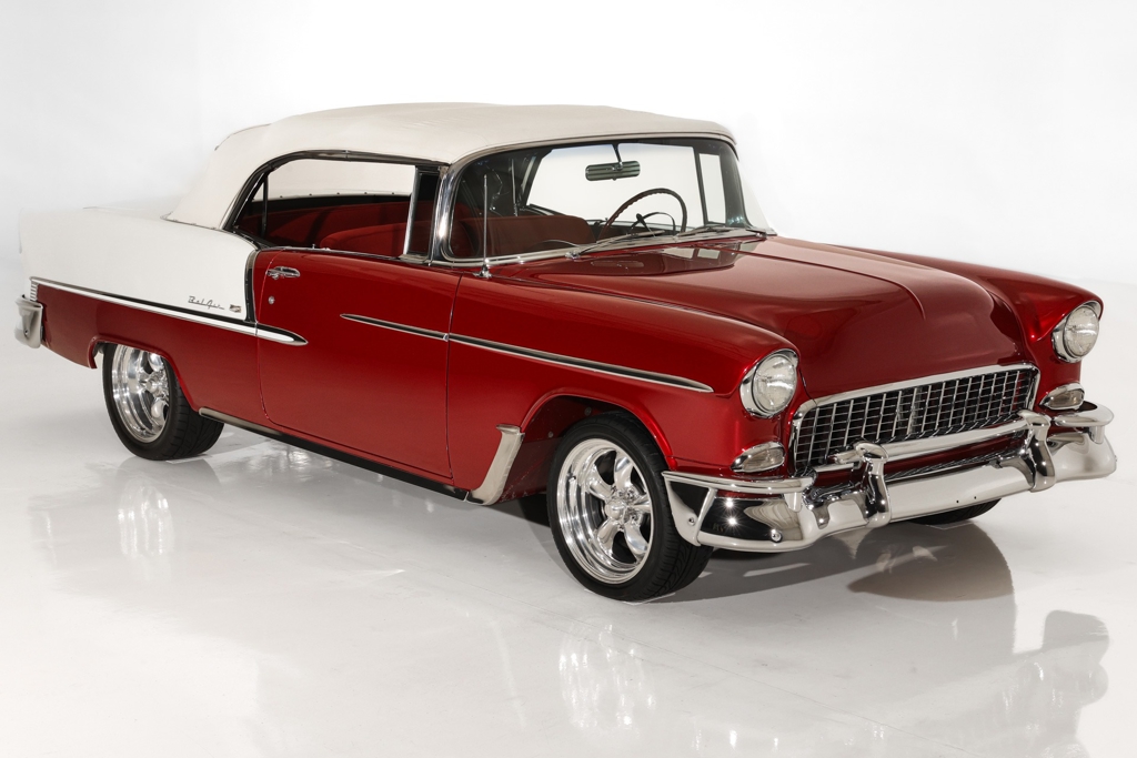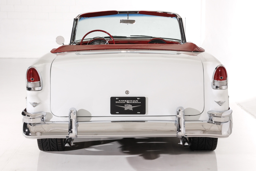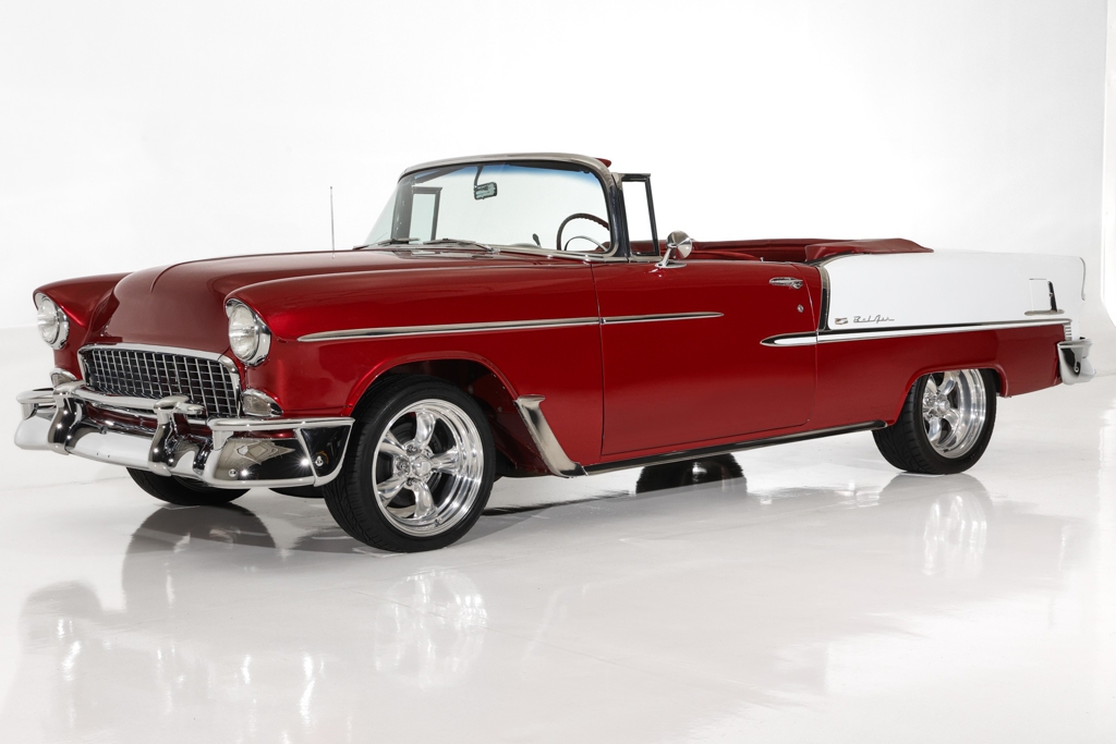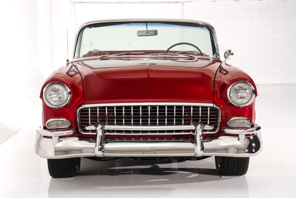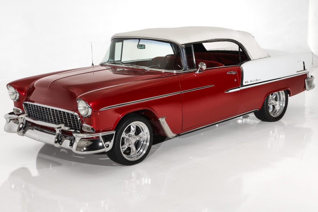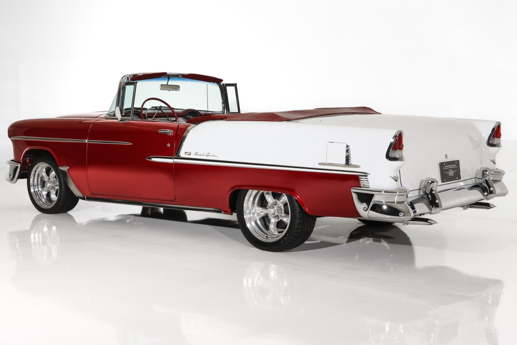 Iconic Ruby Red Metallic and Ivory 1955 Chevrolet Bel Air convertible with white top and matching dark red interior. Powered by a smooth running 327 c.i. V8 engine, automatic transmission and stock rear with a 3.55 gear. The engine compartment is highly detailed with beautiful paint and plenty of chrome. This Bel Air has great metal structure resulting in very good panel fit and lines. Beautiful chrome bumpers, grille and Bel Air stainless trim that makes the Ruby Red paint really pop, especially in the sun. The white power convertible top is in great condition and the rare chrome top frame sets this Bel Air apart from the rest, for that show car appearance. The very nice matching dark red custom interior is in excellent condition and sits very comfortable. The custom interior flows through to the trunk for that impressive finished look. The dash has been painted ruby red to match the exterior and the chrome gauges and stainless trim all look fantastic. The undercarriage is rock solid with excellent frame, floors and trunk. This American Dream Machine is rolling on polished 17 inch American Racing wheels and performance tires for drop dead good looks.
