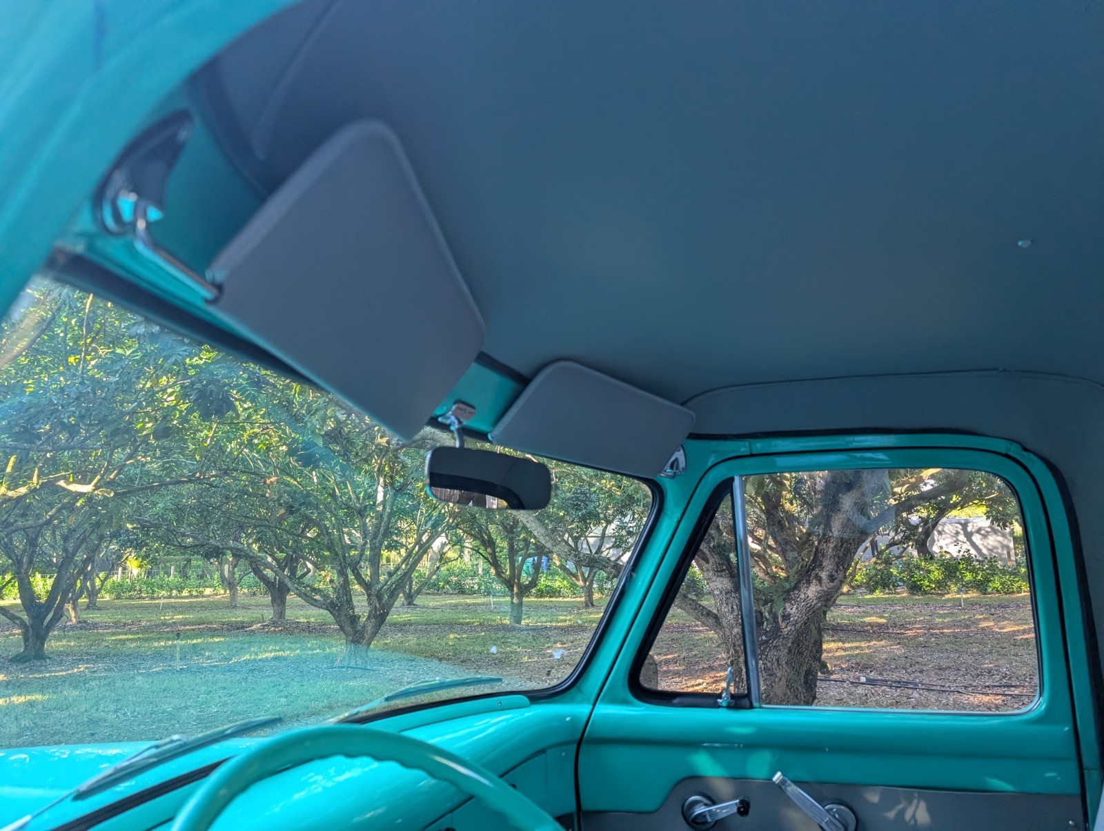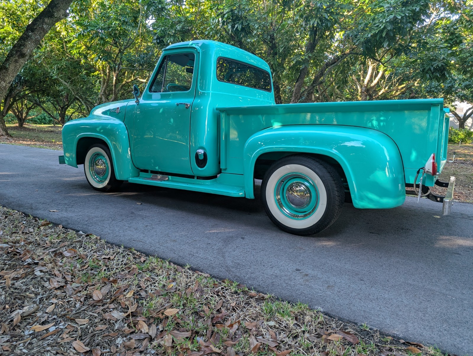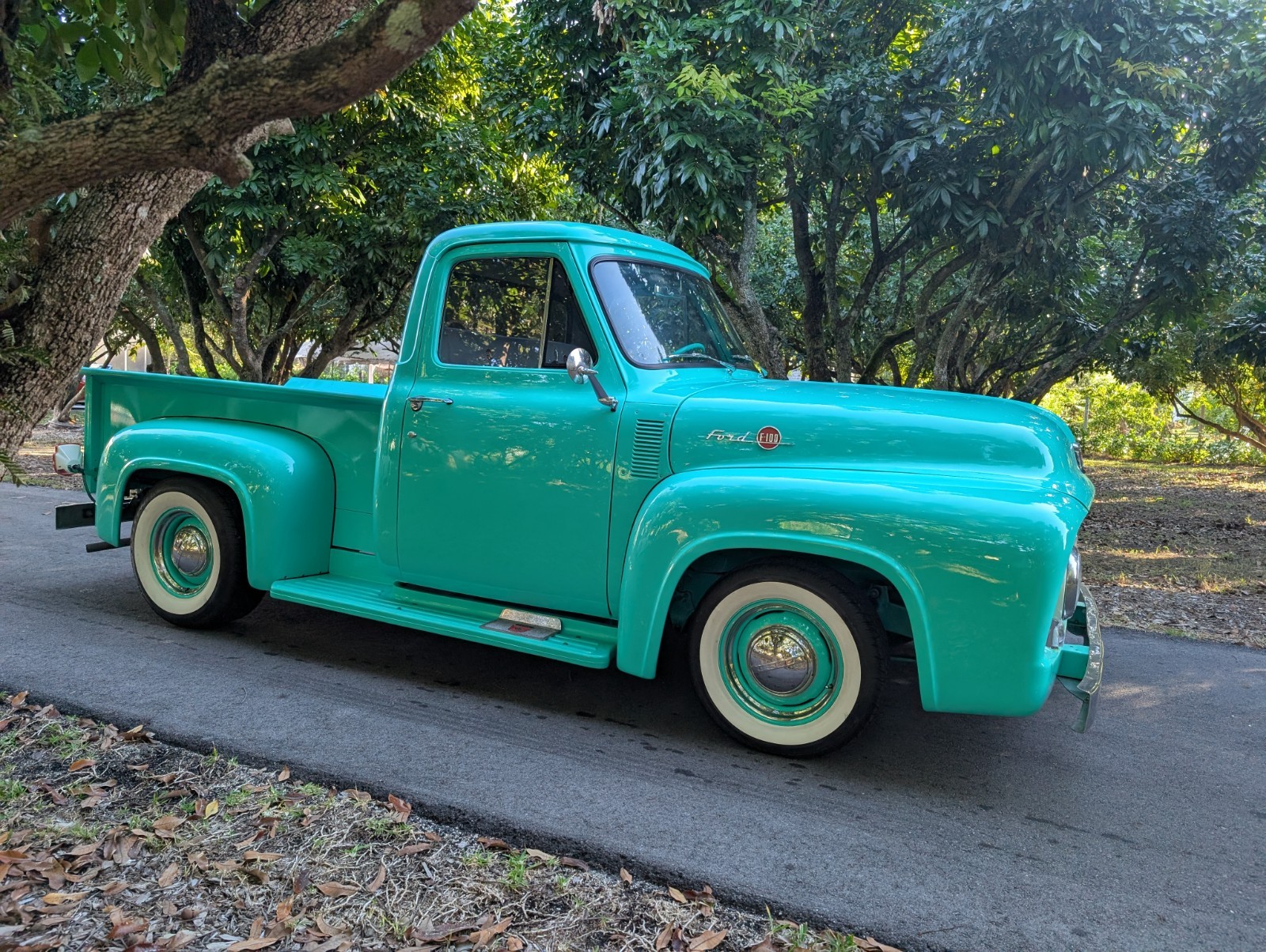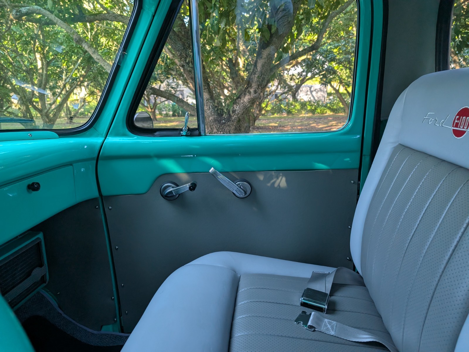 THIS... is a 1955 Ford F-100, finished in turquoise with a gray and turquoise interior.