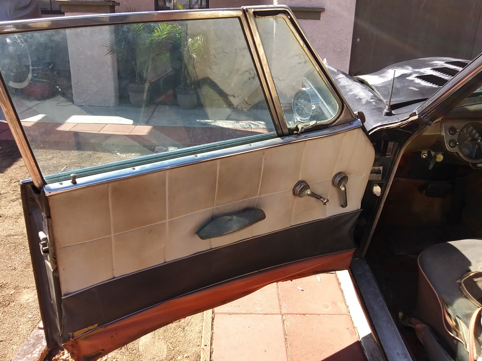 This is the model that doesn't have the window post separation. Both windows meet together when they are rolled up. The engine is seized and it does not turn over. It's been sitting for a long time. Was purchased in California years ago and is now in Las Vegas, Nevada. It comes with the original California yellow plates. I can help arrange transport to your city or overseas transport.
