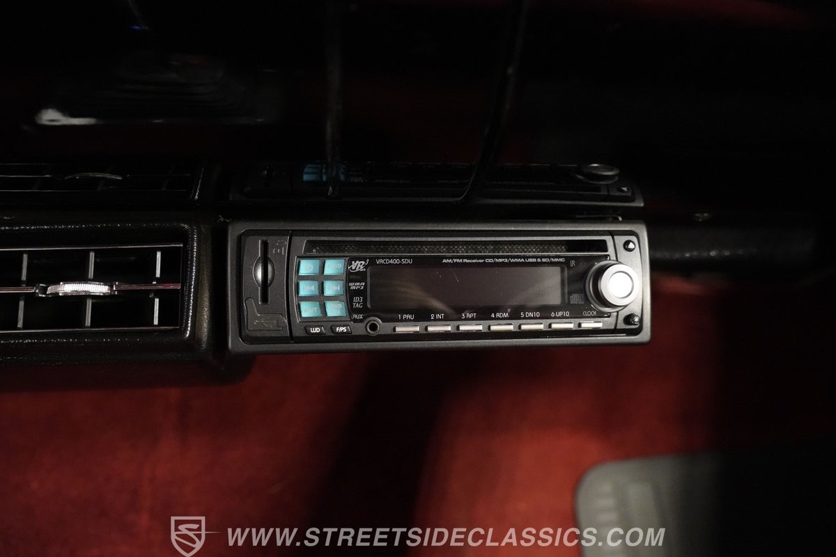 Slide inside and you'll find an interior that perfectly complements the exterior's vintage appeal. The two-tone cloth seats feature a unique bolt-style pattern, blending maroon edges with black inserts that extend to the rear seats. The maroon headliner and matching door panels create a cohesive, inviting atmosphere. The interior shows a tasteful patina of age with minimal fading, while the factory radio remains in place alongside a modern aftermarket radio and tachometer. The Hurst floor shifter adds a sporty touch, making this cabin both stylish and functional.