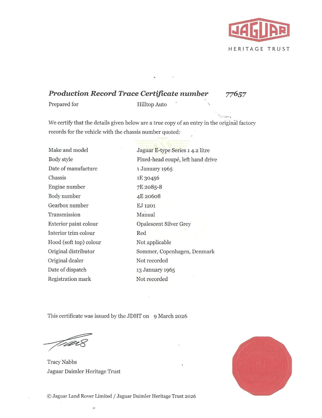 Hilltop Auto Stock # 474 is this matching numbers 1965 Series I Jaguar E-type fixed head coupe with the 4.2 liter engine and originally distributed from Copenhagen, Denmark. This car is being sold for restoration, comes with a clear title and a Jaguar Heritage Certificate.For more information, please call or