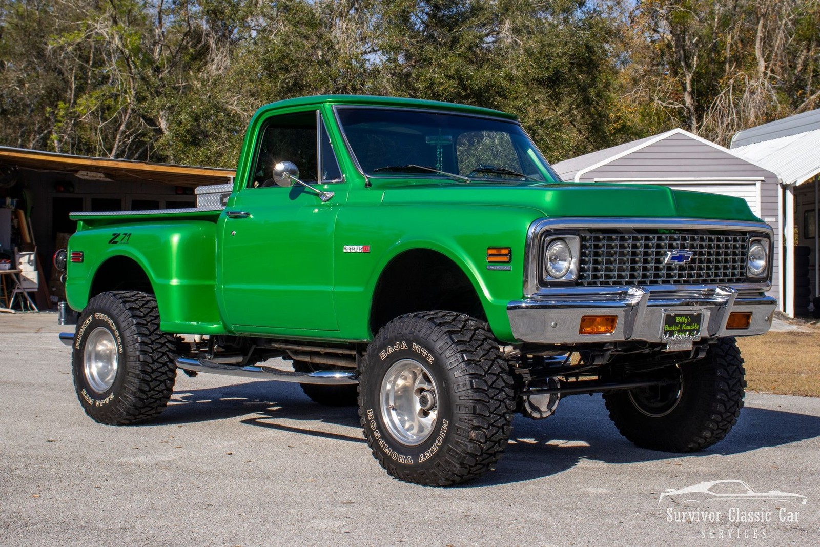 The 1971 Chevrolet C10 is a highly desirable "Action Line" (19671972) pickup, often noted for blending rugged capability with improved comfort & style. This Green is not a factory color, but one that is a beautiful color that attracts the wye. The metallic pearls float to the top of the paint and have a smooth shimmer in the sun. The Chrome Bumpers & Trim are polished to a show finish and a stunning real wood bed that ties everything together.