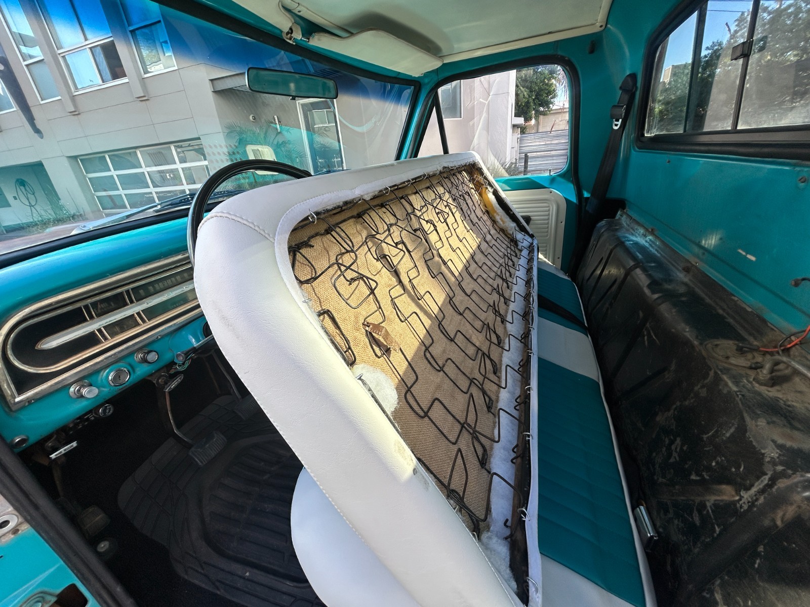 The cabin got a serious refresh in September 2025 — re-padded and re-covered bench seat in sharp white and teal vinyl, matching repainted door panels, fresh headliner, and new carpeting. It's comfortable, clean, and full of that classic truck charm. Center console with cup holders and phone charger, 3-point seatbelts, rubber mats, and sun visors round things out. The odometer shows 39k miles - not sure what the actual total is, but only roughly 3k added on the rebuilt motor. Heater box rebuilt October 2025, and the horn was fixed in April 2025.