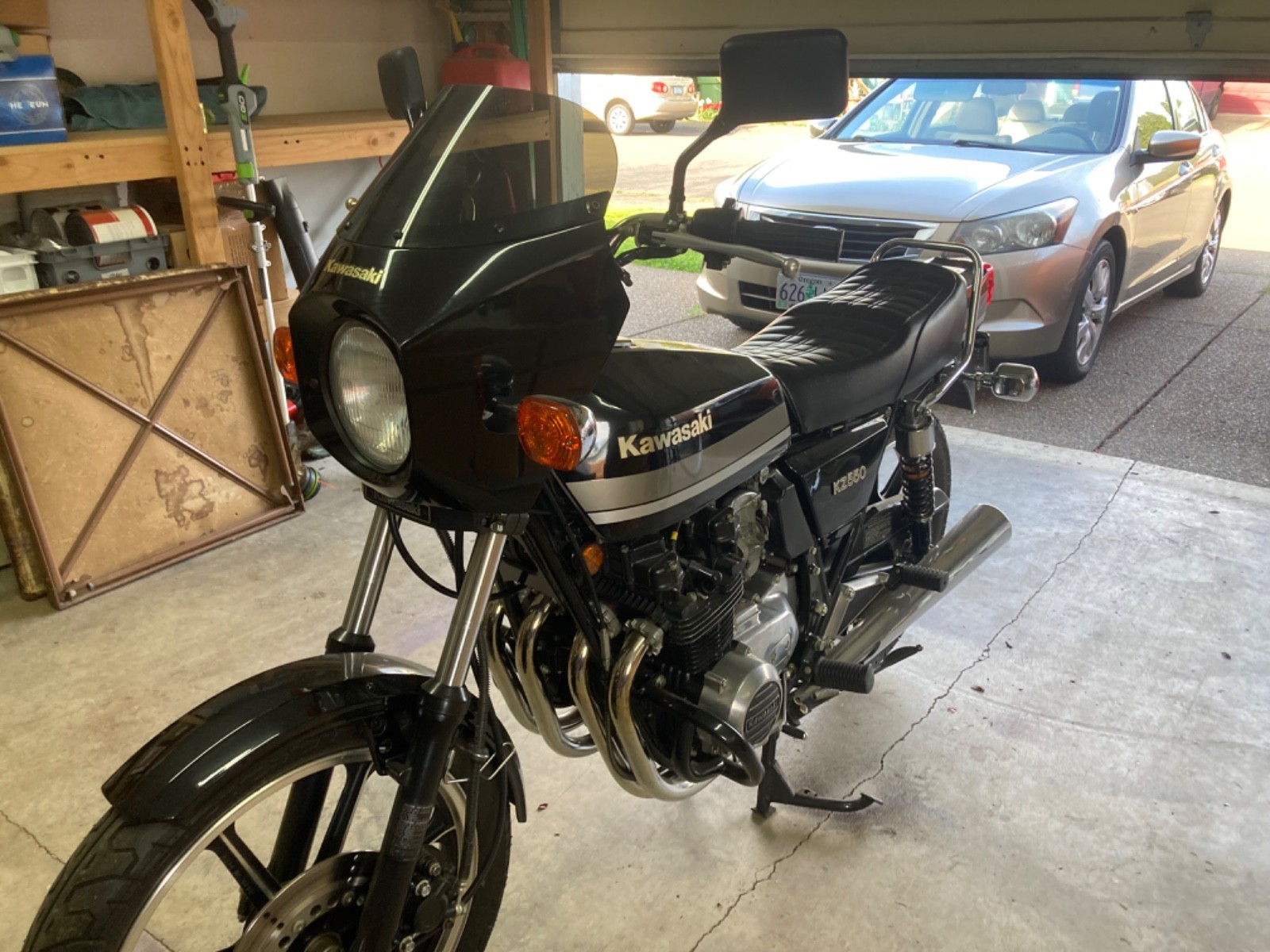 Finished in black with silver detailing, this KZ550 remains highly original and runs great. The bike starts, runs, and rides well, making it equally appealing as a collectible display piece or a weekend rider. It includes its original period accessories, including the front fairing, adding to its authentic vintage character and value.
