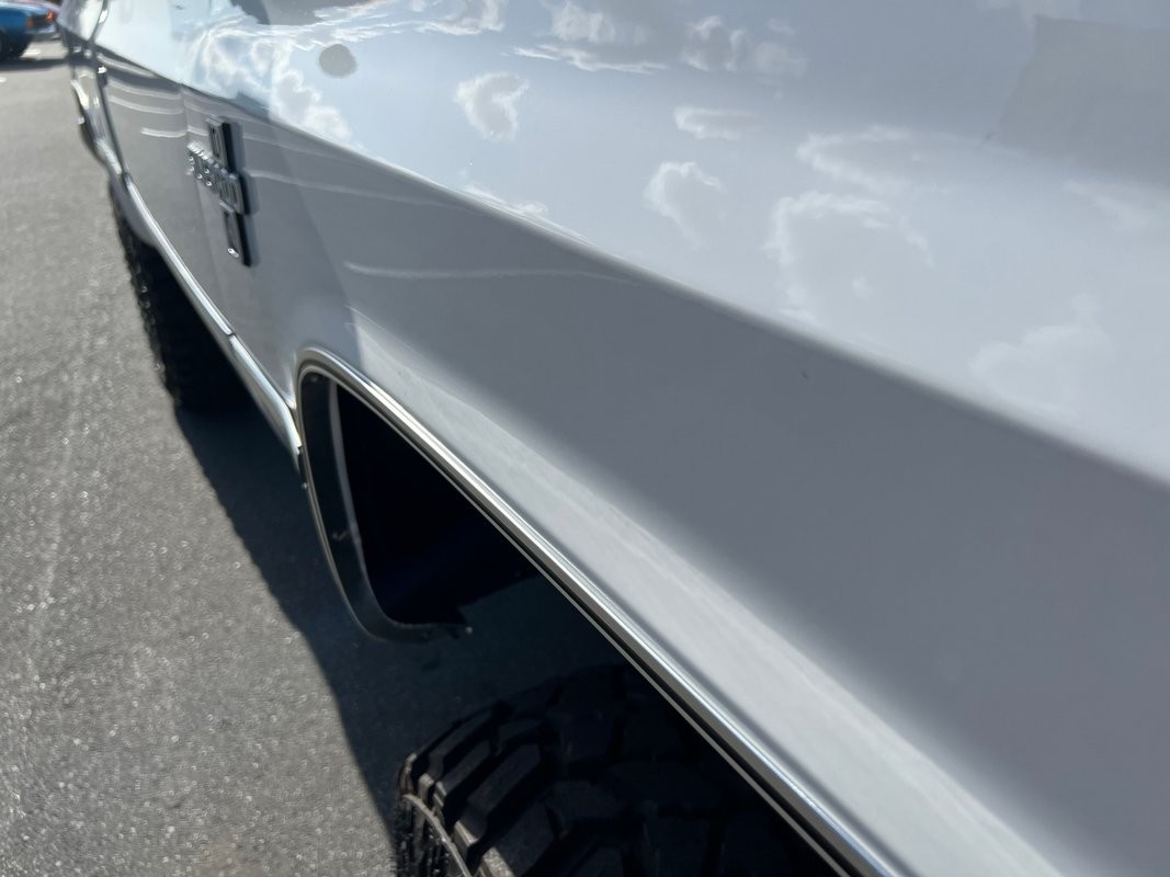 Under the hood sits a 350 crate V8, paired with an automatic overdrive transmission, offering strong, reliable power with the added benefit of comfortable highway cruising. Performance upgrades include an aluminum intake and jet-coated headers with dual exhaust, giving the truck improved airflow and a deep, aggressive tone.