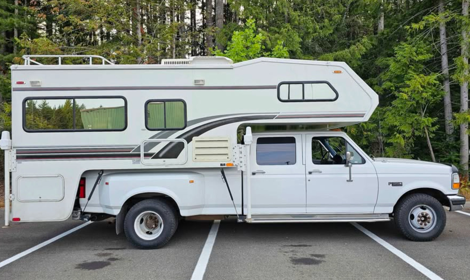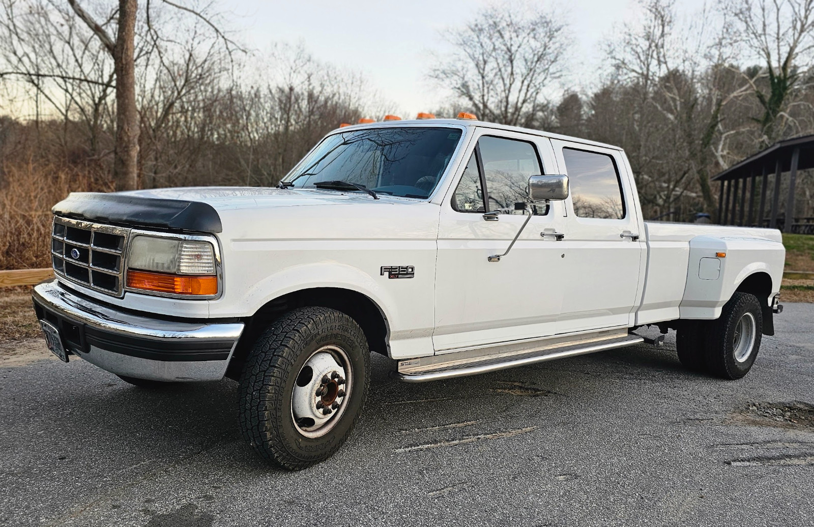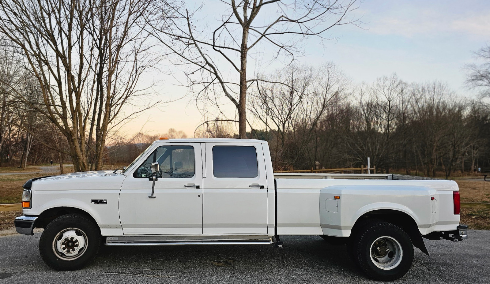 Full size Crew Cab 8ft bed Dually XLT Luxury Original, pristine interior and exterior Soft, nostalgic bench seats Only 123k Original miles Two fuel tanks Locking gas caps an keys 460 V8 — legendary for durability and heavy hauling RWD Power locks & windows Strong AC + heat Full-length running boards Bed liner Multiple keys + fobs Security system Strong, clean frame Heavy Duty Tow package with brake controller / connector Cab/clearance lights Hood Protector / shieldOn-board adjustable air compressor