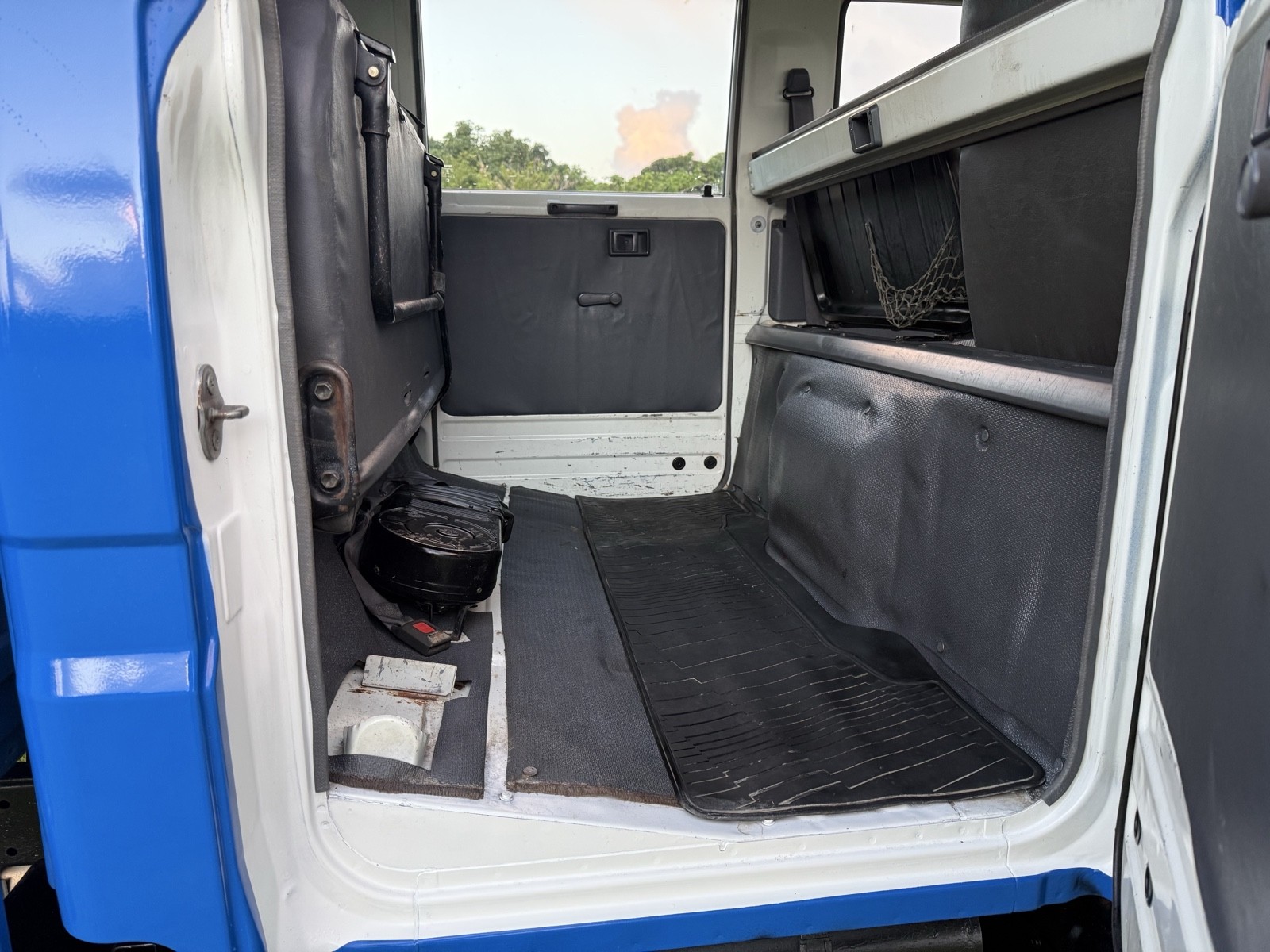 The right-hand-drive cabin has seating surfaces upholstered in gray cloth along with rubber floor mats, folding seatbacks, air conditioning, and a radio.