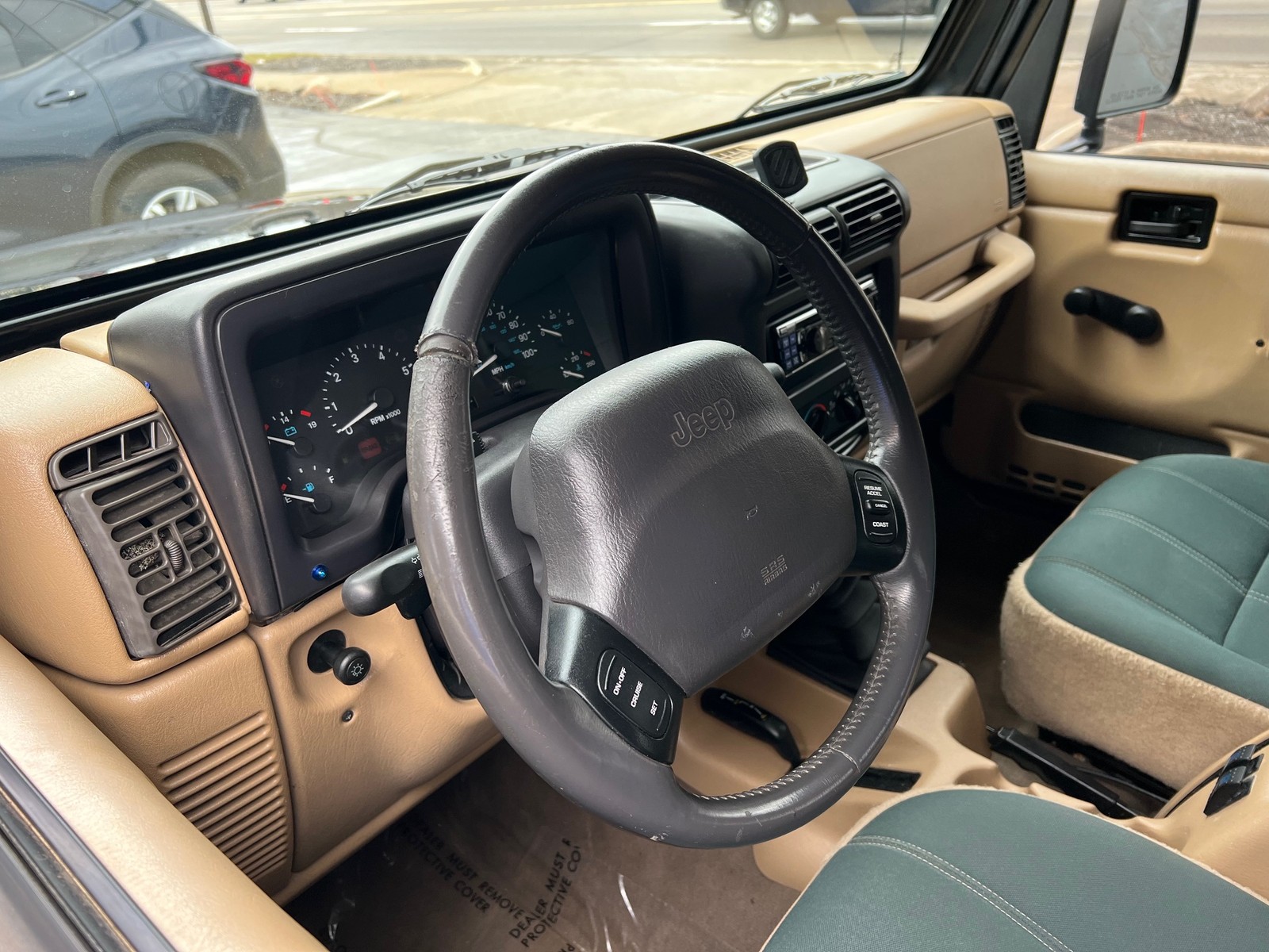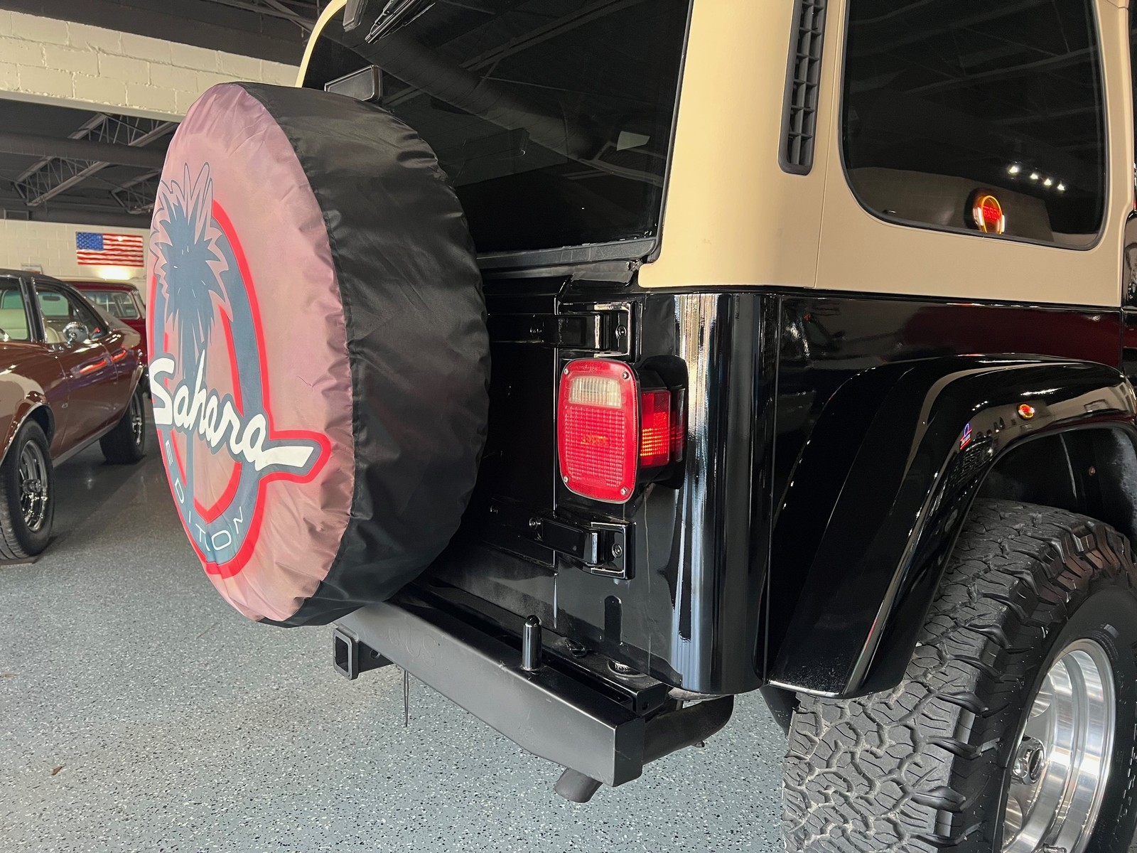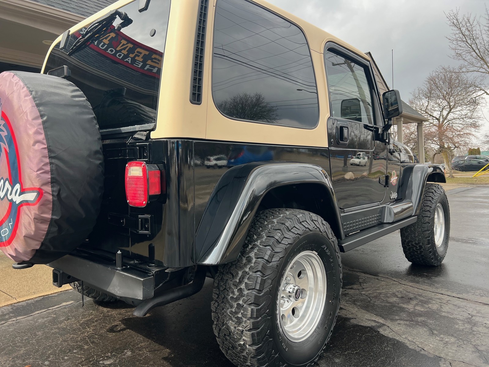 1 Owner Sahara Edition 4X4, beautiful black paint, tan removeable top, two tone cloth interior, 4.0 liter L6 engine, 5 speed manual transmission, cold air intake, power steering, power disc brakes, air conditioning, bucket seats with center console, tilt column, factory tach & gauges, Alpine sound system, cruise control, rear defog, factory single exhaust, factory front & rear axles, Skyjacker suspension kit, 32X11.5R15 BF Goodrich All-Terraine K02 tires, 15" American Racing Baja wheels, dual mirrors, custom front bumper with fog lights, tinted glass, clean Carfax, Ready to Cruise!