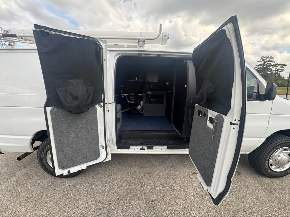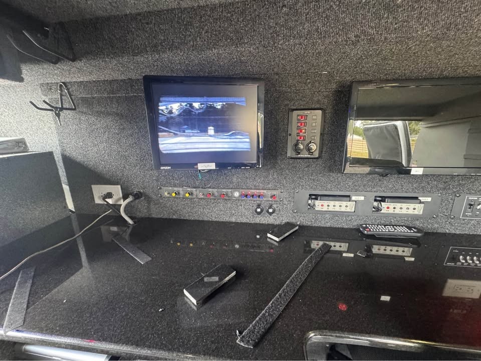 It features, a rear cargo area locking bulkhead door with a dead-man starting switch. The cargo area is built out as a working space for surveillances for up to 12 hours of continuous operations with five D8 Batteries which are charged with on board PROsine 2.0 inverter/ 100 Amp charger and dashboard controller. Additionally, the workspace is equipped with stand-alone HVAC system. The desktop features three video monitors and three digital video recorders. One recorder and monitor are primary designated for the four-camera perimeter security camera/audio system that cover the exterior of the vehicle during use. Additionally, on the interior wall there is a mixing board for multiple audio inputs. The other recorders and monitors are designated for two IP window mounted pan tilt and zoom cameras and a roof mounted 360~ Star periscope. The rear windows are black out tinted with window/camera covers. Each window is outfitted with power and video connections as well as multiple mounts for additional cameras. The complete system is managed and controlled with a laptop and cellular modem (Not Included).
