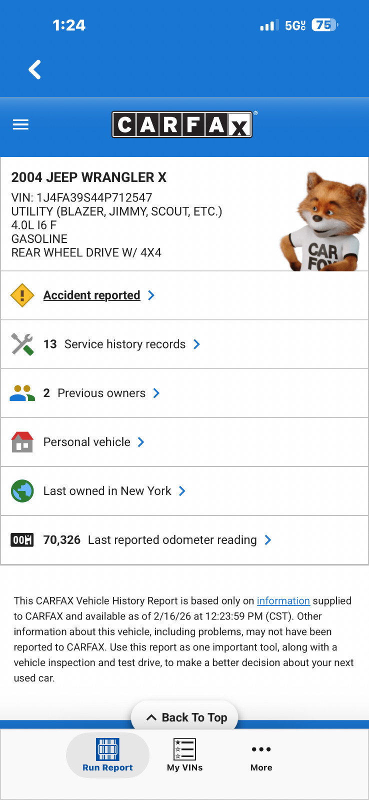 for sale is a car that was recently traded in to a local new car dealership.the car currently has no leaks no smoke and no check engine lights on. the car has no unusual or problematic sounds. this vehicle starts right up the engine runs smooth and quiet, the transmission shifts well, the front end tracks straight and the exhaust is quiet.ONLY 75000MILES!!! the brakes and tires still have plenty of life on them. the electronics, windows heat and ac are all in working order. the body and paint are in excellent condition but the car will have some minor dents dings chips or scratches but far less than you would expect of a vehicle this age.this jeep does have some minor rust. chassis is still good there is some minor blistering and scaling but no breaks.there is some minor blistering and flaking on the rockers and quarters. the fenders are solid w a few small blisters. windshield frame has minor rust. floors have been reinforced with sheet metal.the interior shows only minor wear with no major rips or stains, and the previous owner was a non smoker. top is in very good condition.please review photos as what you see is what you get and continue to read and understand all of the terms and conditions of sale.
