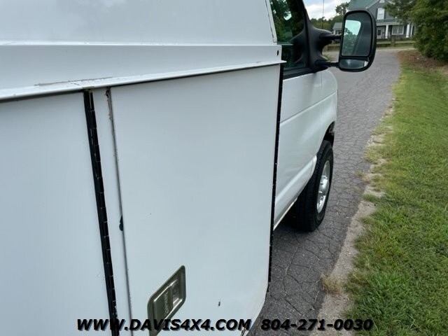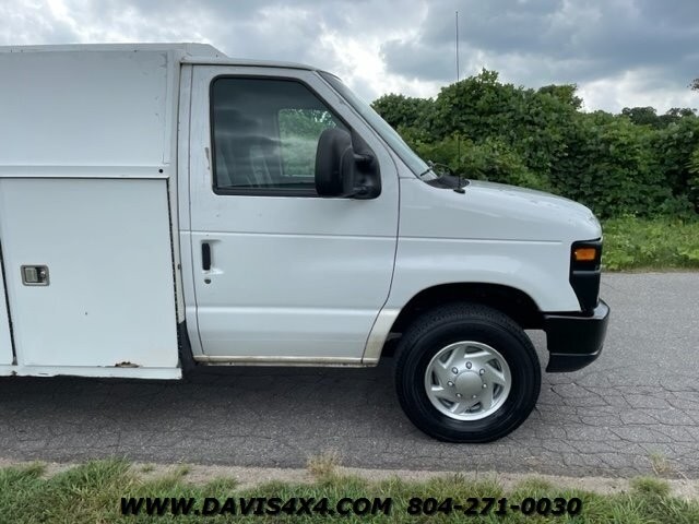 2011 Ford E350 Knapheide Utility Work Body KUV Style Van. This enclosed utility body has the rear storage access doors designed just like a KUB body, freshly serviced and inspected and ready to put to work, higher mileage but runs out excellent, has the access door from the cab to the back, eight external storage area doors as well as two rear access and walk-in platform access with rear receiver towing hitch, slide locks as well as independent door locks. Also we have a decent selection of these vans currently in lots of different shapes, sizes and configurations. This unit has some dings dents and scratches and some areas where the previous removed paint, this can be easily covered with a fresh wrap or decal logo or this unit can be repainted customers choice of colors for $2000. Check our website of bucket trucks, box trucks, utility trucks, flatbed tow trucks, wreckers, rollbacks and other gas and diesel pickup trucks in stock.