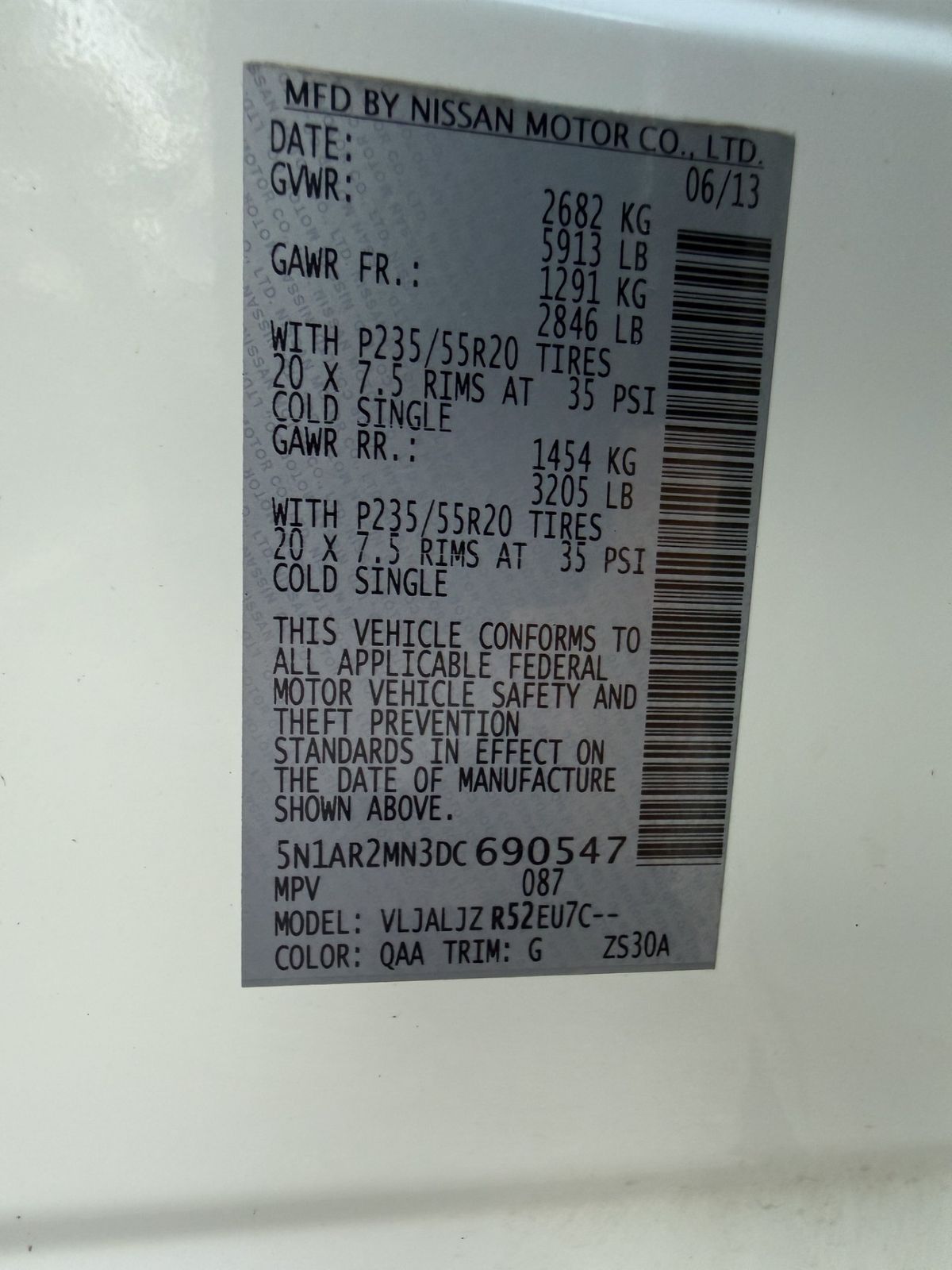 | Year: | 2013 | VIN: | 5N1AR2MN3DC690547 |