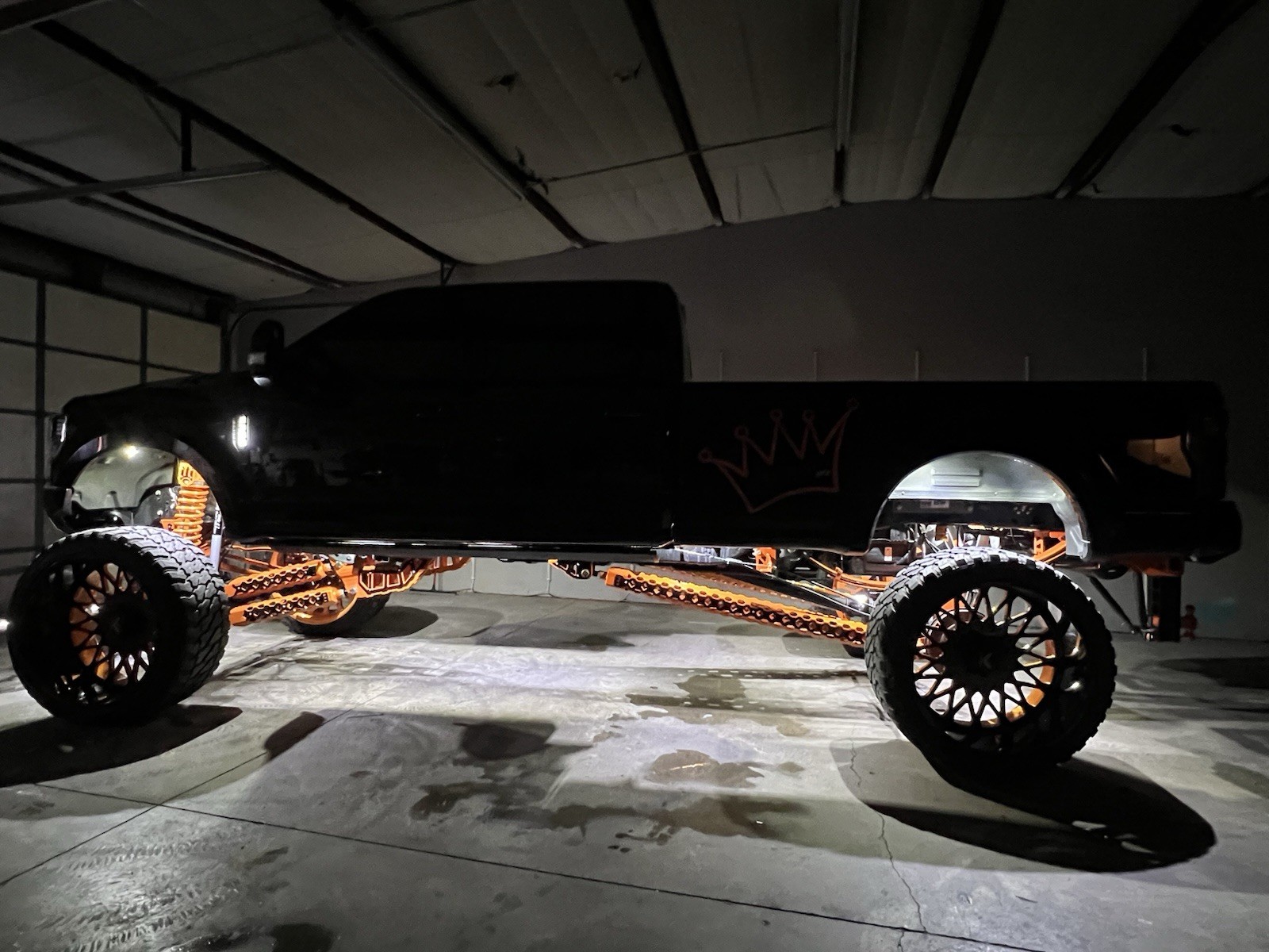 Despite the aggressive stance and massive lift, this truck drives straight and smooth on the interstate β honestly like a car. It has lived in a climate-controlled shop, never sees snow or rain, and is only driven locally and occasionally to dinner. You will be hard-pressed to find a cleaner, better-maintained modified F-350.