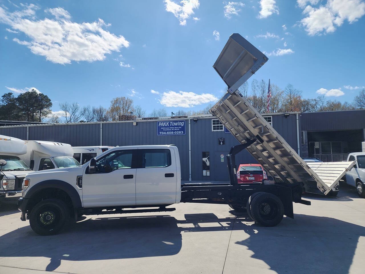 OPTIONS: GVWR: 19,500 lb, Crew Cab, Electric over Hydraulic Tilt Aluminum Flatbed Dump Bed by EBY, Manual Driver Seat, Manual Passenger Seat, Gray Leather Interior, 6 Passenger Seating, Foldable Middle Seat, Bluetooth Connectivity, Power Mirrors, Extendable Tow Mirrors, Power Door Locks, Power Windows, Automatic Headlights Control, Steering Wheel Controls, Cruise Control, Running Boards, Heavy Duty Towing Package, Factory Built-In Trailer Brake Control Module, Dual Rear Wheels, Climate Control, BOSS Snow Plow Push Plate Installed, and much more!!!