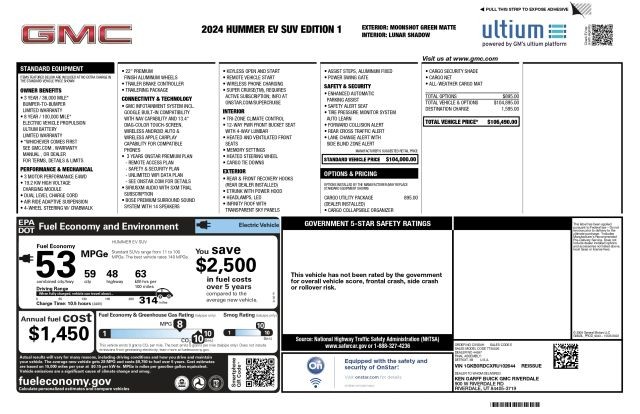 This 2024 HUMMER EV SUV Edition 1 has all the standard equipment 22? premium finish aluminum wheels, Ultium battery platform, 4-wheel steering with CrabWalk, adaptive air suspension, 3-motor performance AWD, Bose 14-speaker premium audio, transparent Infinity Roof sky panels, tri-zone climate control, heated/ventilated front seats, wireless charging, Google Built-In, Super Cruise capability (subscription required)? and much more.