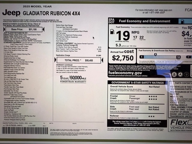 $683 P/MO, $200 DOWN, 84 MONTHS, 5.99% APR (WITH APPROVED CREDIT).* ALL DEALER FEES ARE INCLUDED IN OUR PRICE! This is a new 2025 Jeep Gladiator Rubicon 4WD. It comes with the 3 year - 36,000 mile Factory Bumper to Bumper Warranty as well as a 5 year - 60,000 Factory Powertrain Warranty. It is equipped with a 3.6L V6 24V VVT Engine with Stop/Start, 8-Speed Automatic Transmission, 4:1 Rock-Trac Part-Time 4WD System, Heavy-Duty Dana 44Wide Front and Rear Axle, 4.10 Axle Ratio, Full-Speed Forward Collision Warning Plus, Advanced Brake-Assist, ParkView Rear Back-Up Camera, Adaptive Cruise Control with Stop, Selec-Speed Control, Front Disconnecting Stabilizer Bar, Tru-Lok Front and Rear Axle, Fuel Tank Skid-Plate Shield, Transfer Case Skid-Plate Shield, Transmission Skid-Plate, Front Bumper Skid-Plate, Selectable Tire-Fill Alert, Terrain-Specific Off-Road Plus Mode, Electronic Trailer Sway Control, UConnect 5 with 12.3-Inch Touch Screen Display, Apple CarPlay, Google Android Auto, SiriusXM 360L with 3-Month Sub Call 800-643-2112, Alexa Built-In (Wi-Fi Required), Handsfree Phone and Audio, 4G LTE Wi-Fi Hotspot, 4 Programmable Auxiliary Switches, Emergency/Assistance Call, Full-Function Media Hub with 2-USB Plus Aux Port, Front Door Passive Entry and Lock, Premium-Wrapped Steering Wheel, Behind-Rear-Seat Storage, 17-Inch x 7.5-Inch Machined/Painted Black Wheels, LED Tail Lamps, LED Front Turn Signals and Parking Lamps, LED Premium Reflector Headlamps, Full-Size Spare Tire, Dual Venter Hood, All-Weather Slush Mats by Mopar, Black Freedom Top 3-Piece Hard Top, Body-Color Rubicon Highline Flare, and Customer Preferred Package 24R. The MSRP on this 2025 Jeep Gladiator Rubicon 4WD is $55,455. Our Internet and E-Bay pricing include rebates/incentives. You may qualify for additional rebate or discount. Please contact our sales department for details. *Financing: Sample payments are based on approved credit. Finance rates are available through Ally Bank or TD Bank. The price or payment does not include sales tax/tag, this is due to each state having a different sales tax rate. *A.P.R. - Annual Percentage Rate - The annual rate that is charged for borrowing, expressed as a number that expresses the yearly cost for the term of the loan. Click here for more information - www.consumerfinance.gov